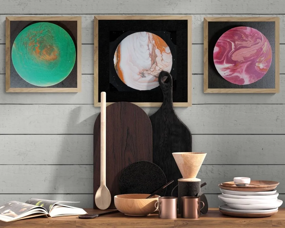 Group of fluid art on round canvases