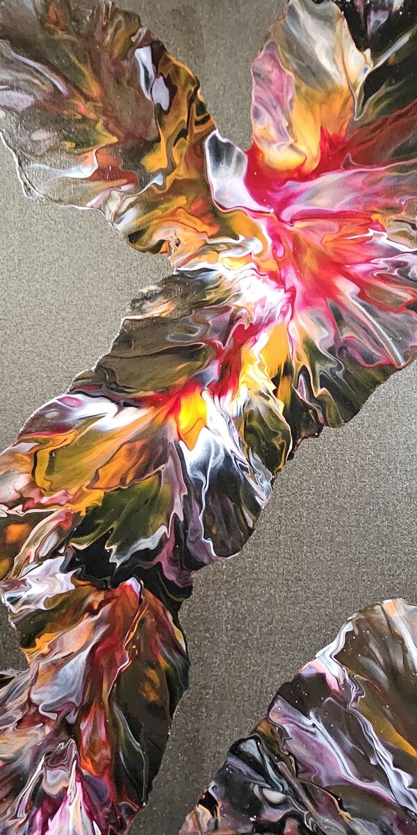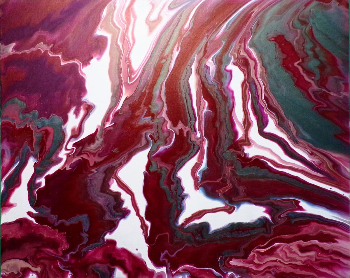 "Reds on Ice" 24" x 30" x .75" canvas painting. This painting features the acrylic pour paint color 'Fairy Spit'. It is the dark metallic (gray) in my painting. "Reds On Ice" is created using white acrylic paint. The acrylic paints used by me are from the brand, Mixed Media Girl.